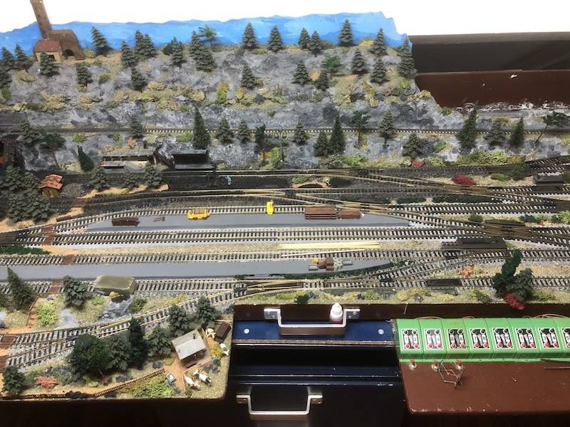Een overzicht vanaf het seinhuis met alle sporen en wissels die ik op het ogenblik heb liggen. Vroeger hadden we twee wissels met een station en liep de baan in een ovaal. Altijd heb ik als kind de wens gehad om een groot rangeer terrein te bouwen met veel kolenwagonnetjes. Dat is op dit moment wel gelukt.