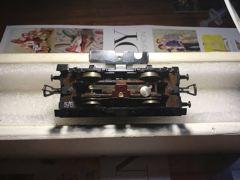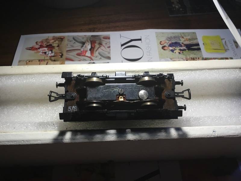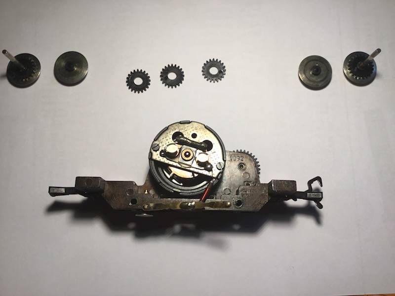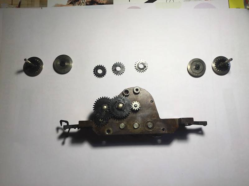 Deze trein had een piepend geluid als die iets bewoog, en dat was al niet vel. Dus aan de slag om te kijken of ik dat opgelost kon krijgen. Eerst maar even de beschermkap eraf gehaald waar de geleiders en radertjes mee beschermd zitten.
