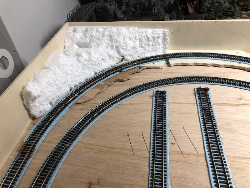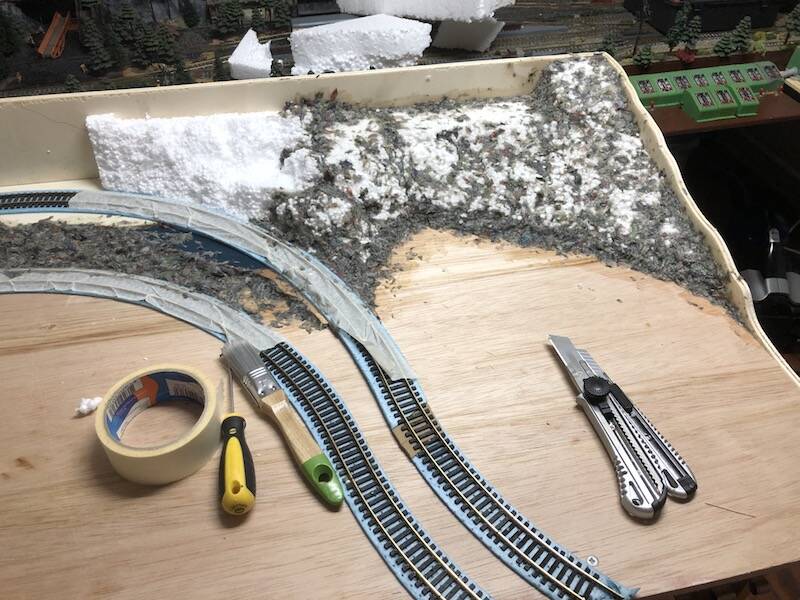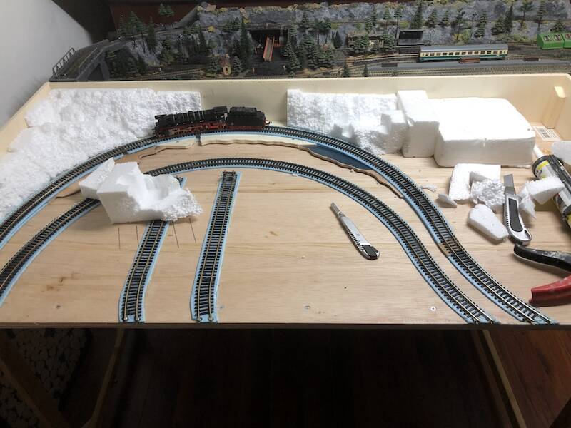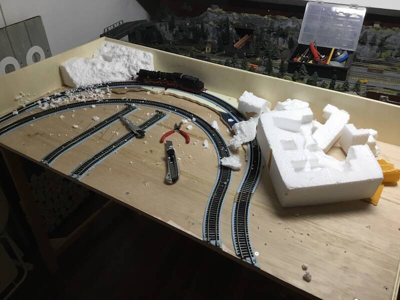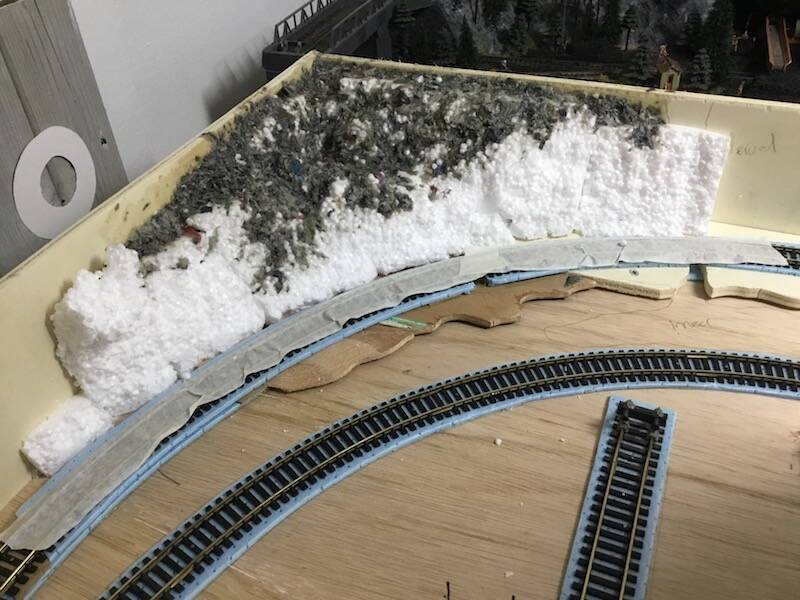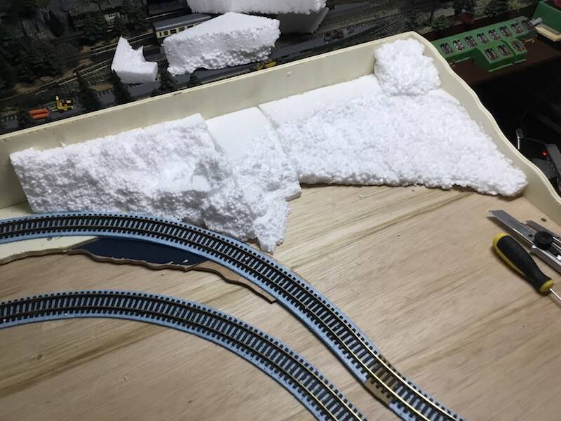 Om te zorgen dat de modules licht blijven om op te zetten en ook handelbaar, worden de bergen gemaakt van piepschuim. Een heerlijk licht materiaal om mee te werken, makkelijk om te vormen en snel klaar. Het enigste nadeel is natuurlijk de rommel van alle piepschuim balletjes, maar daar is de stof zuiger weer goed voor. Er komt ook een watervalletje op deze plek, maar dat moet allemaal nog vorm krijgen.