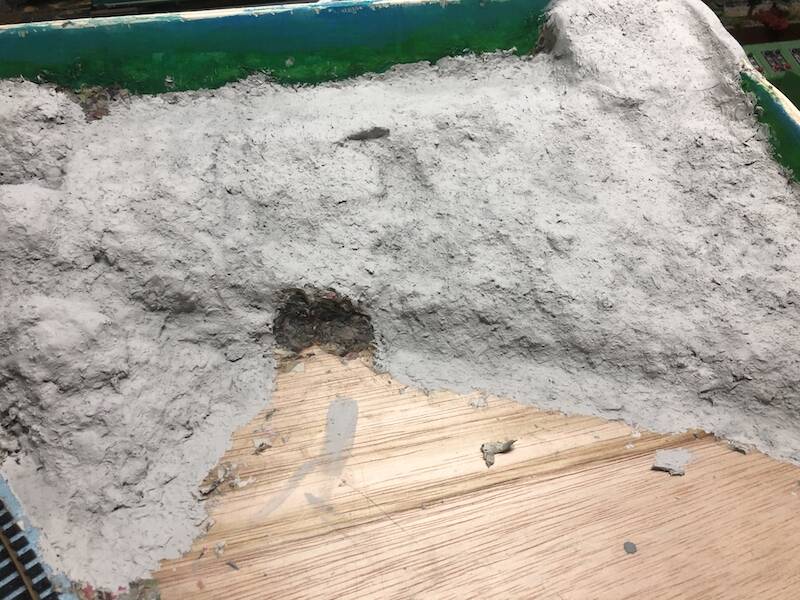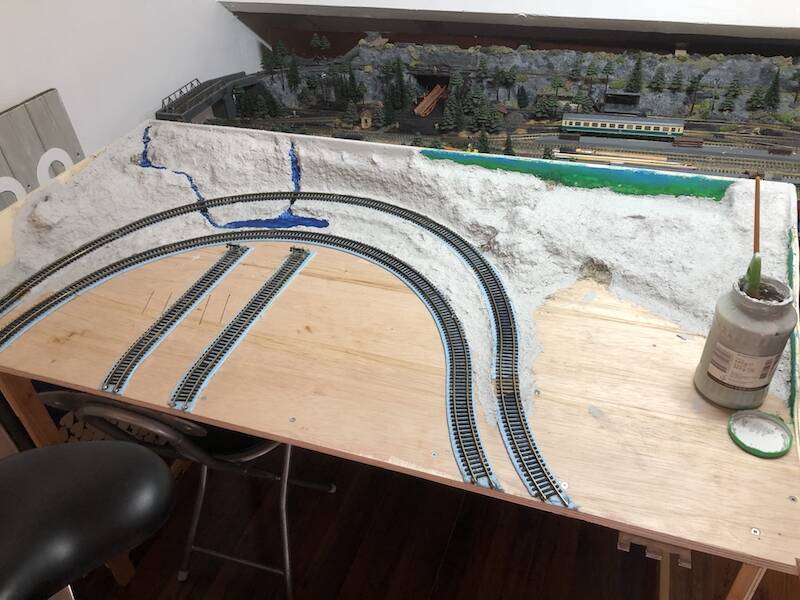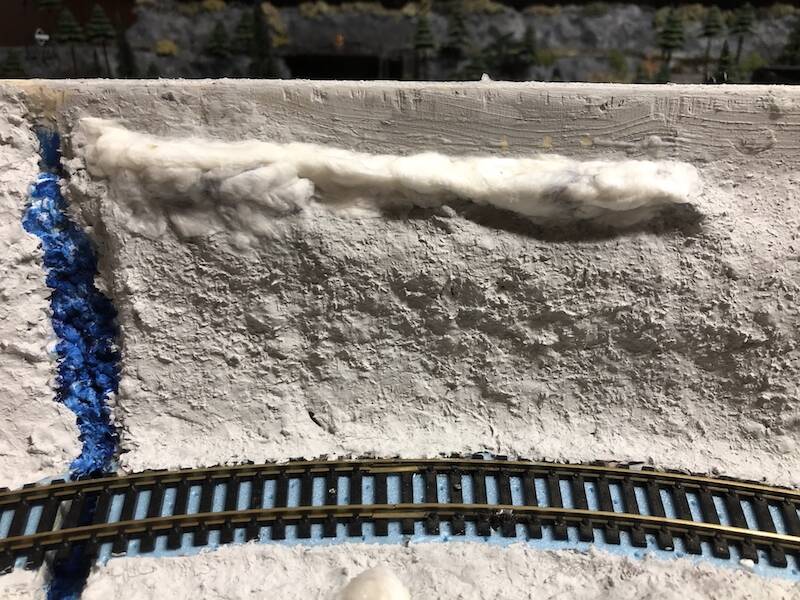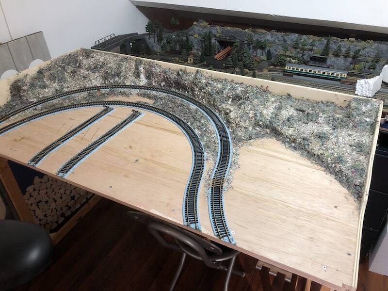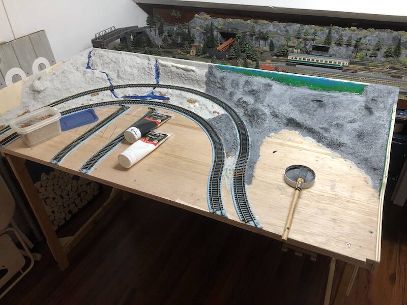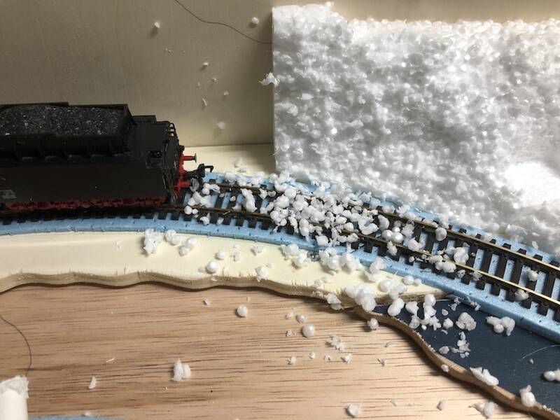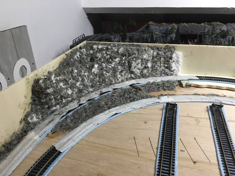 Om te zorgen dat de modules licht blijven om op te zetten en ook handelbaar, worden de bergen gemaakt van piepschuim. Een heerlijk licht materiaal om mee te werken, makkelijk om te vormen en snel klaar. Het enigste nadeel is natuurlijk de rommel van alle piepschuim balletjes, maar daar is de stof zuiger weer goed voor. Er komt ook een watervalletje op deze plek, maar dat moet allemaal nog vorm krijgen.