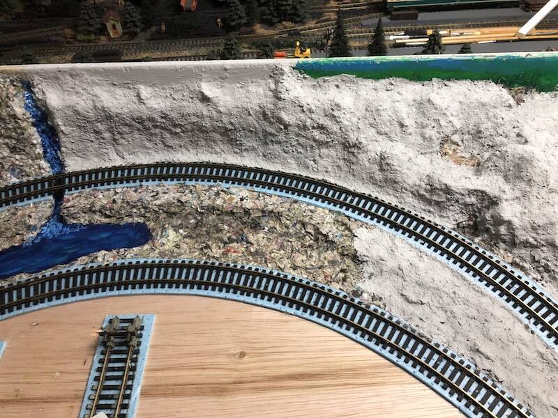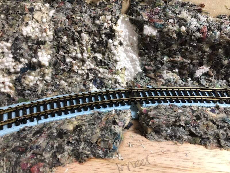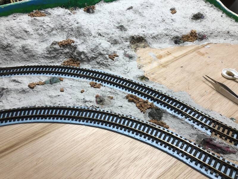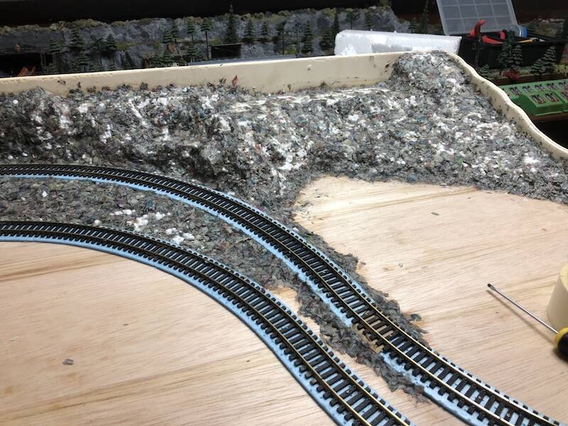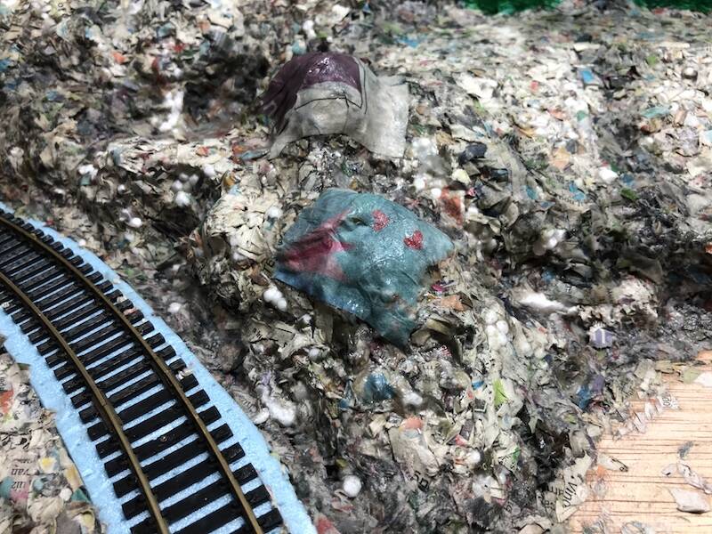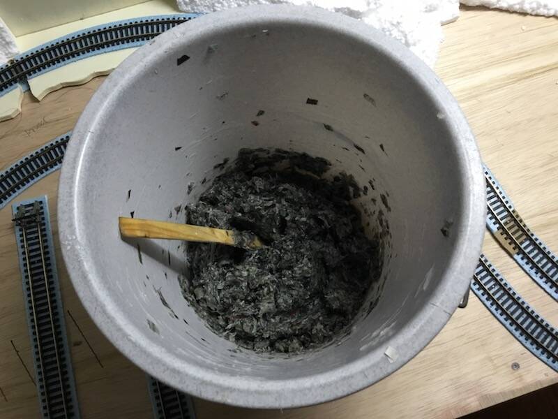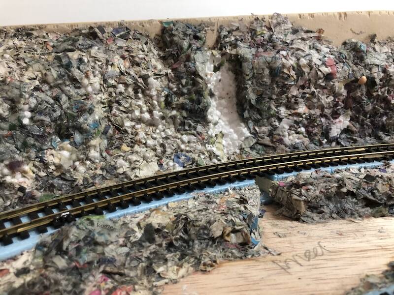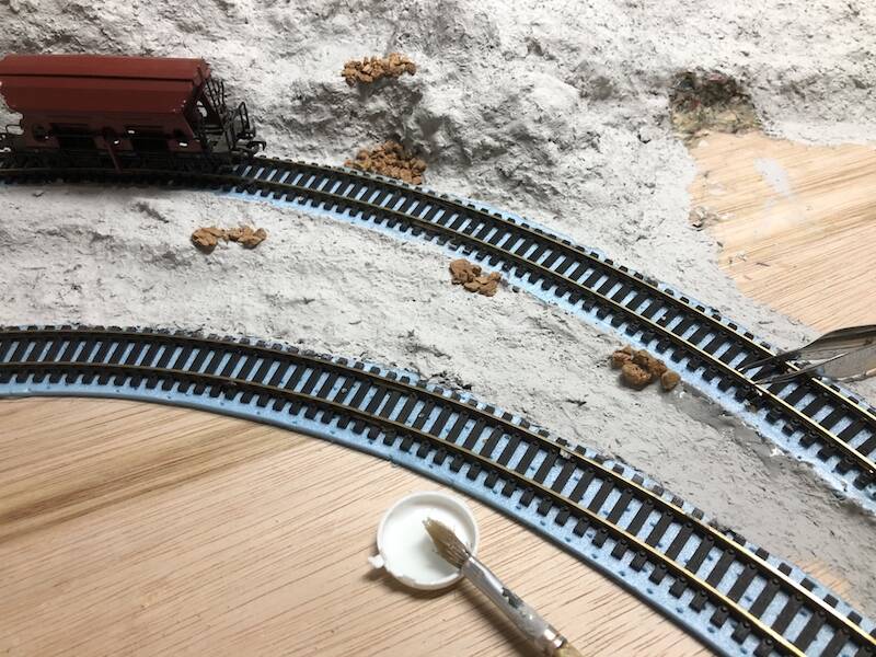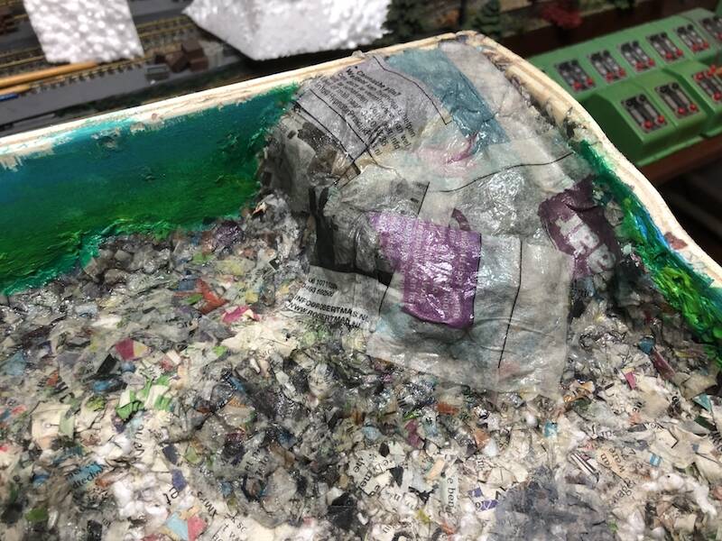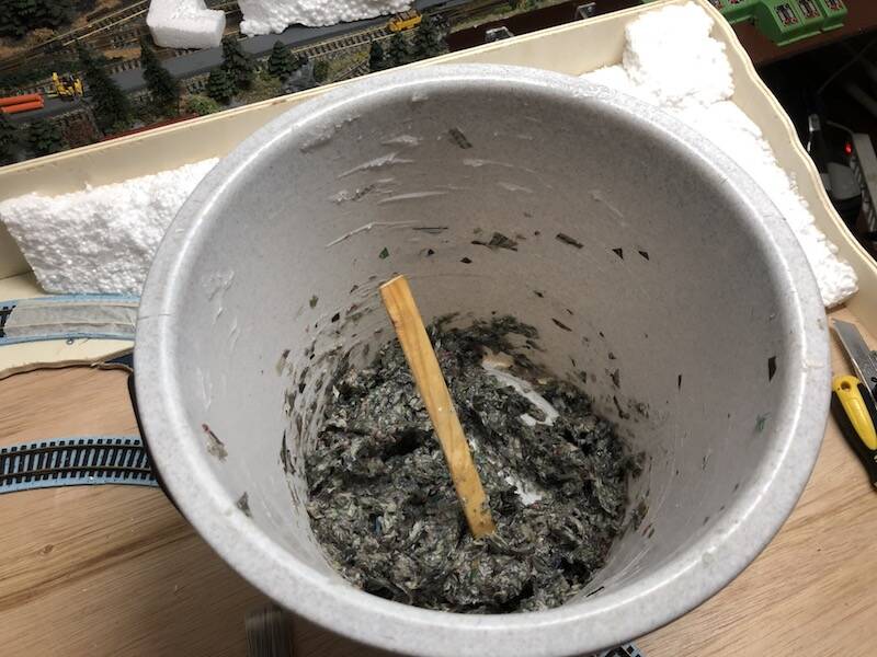 Omdat de kurk stukjes best wel wat klein zijn, ga ik aan de slag met WC papier om iets groter puin te maken wat tussen de rails en bij de bergen komt te liggen. Het leuke is dat je met WC papier toch iets meer kan vormen en kneden. Ach, en zo blijf je lekker bezig met alles.