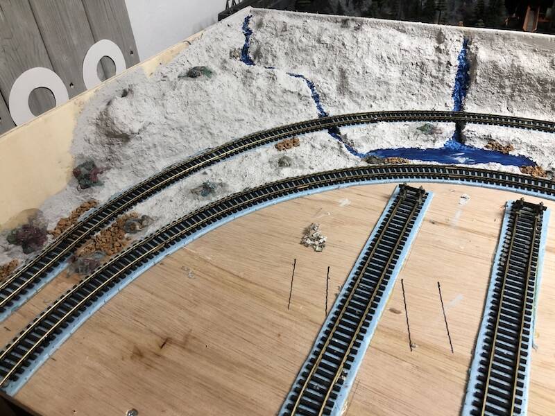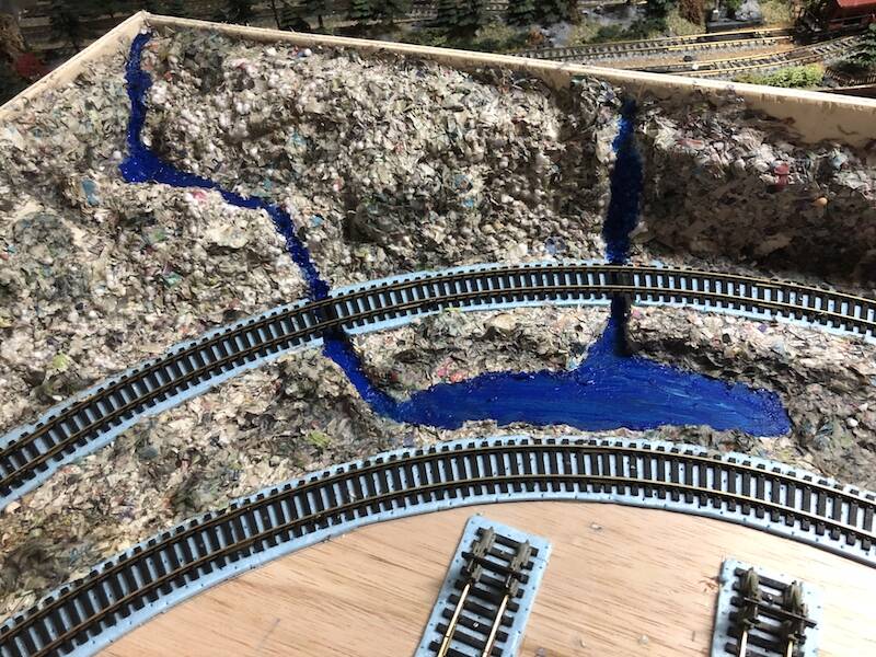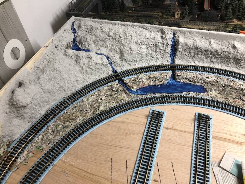 Het mag ook weer niet te hoog worden, want dan heb je weer last van het neerzetten van de module bak op de grond. Maar op deze manier krijg je toch een diepte in het geheel en is het allemaal net iets speelser. En een waterval moet toch wel onder de rails doorlopen.