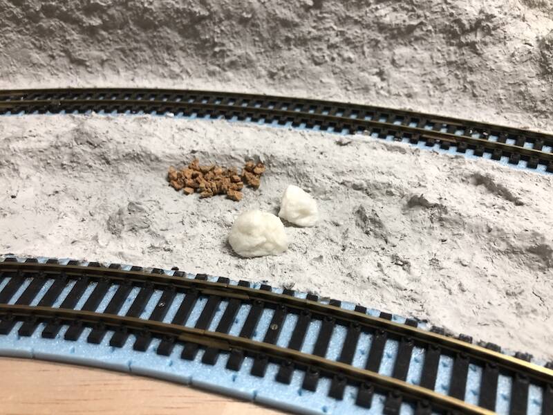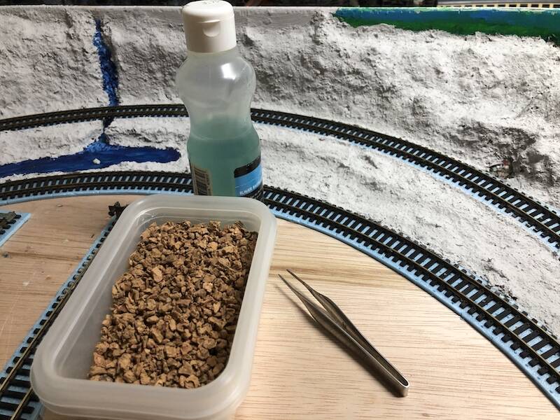 Ook kleine rotsen en afgevallen puin wil ik bij de bergen hebben en dat kun je weer heel mooi maken met stukjes kurk. Dus aan de slag maar weer met een bak kurk, lijm en een pincet. Eens kijken wat dat weer voor effect heeft op het gehele landschap als we daarmee klaar zijn.