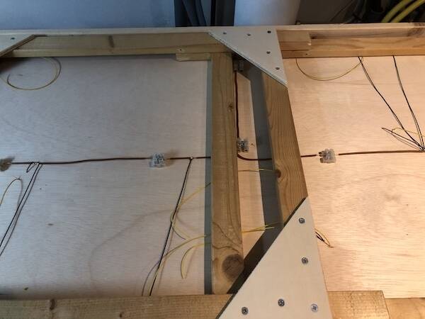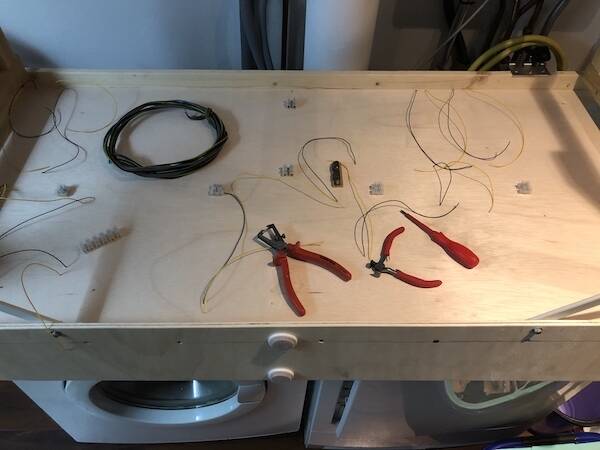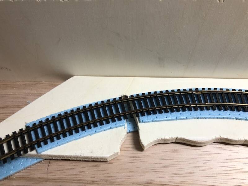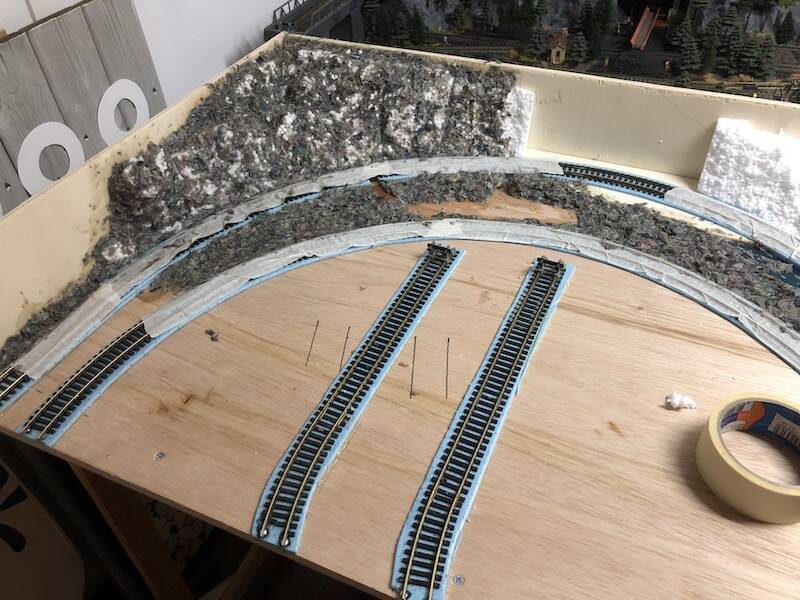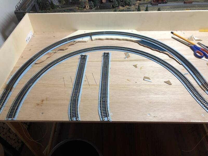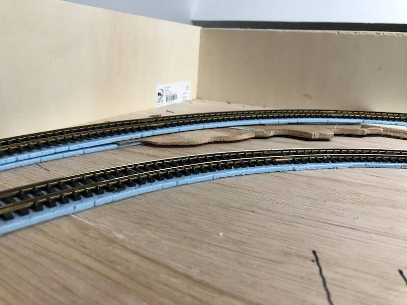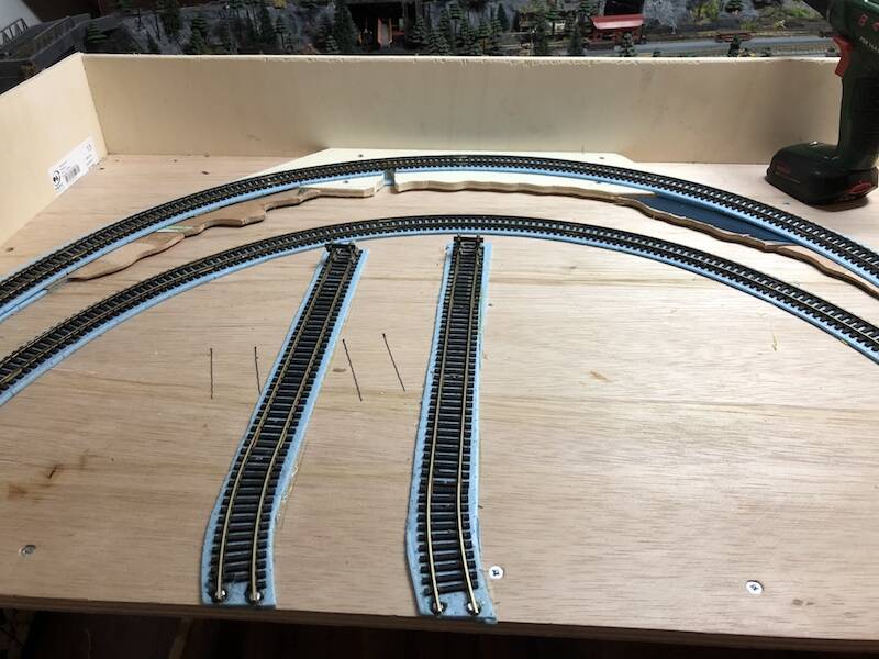 Voordat ik aan de bergen ga beginnen eerst maar even de ringleiding vastleggen en alle rails gelijk bevestigen. Zodat ik dat straks niet hoef te doen als de piepschuimen berg achter in is gezet. Doordat ik deze module op zijn kop leg is dat toch wel makkelijk als dat er nog niet op ligt.